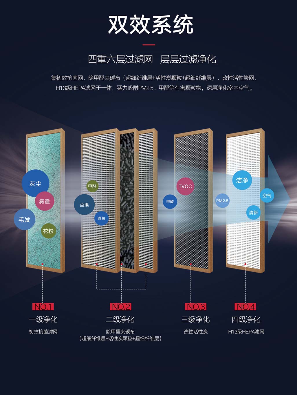 過濾工藝:初效抗菌除濾網+除甲醛夾炭布+改性活性炭+H13級HEPA濾網