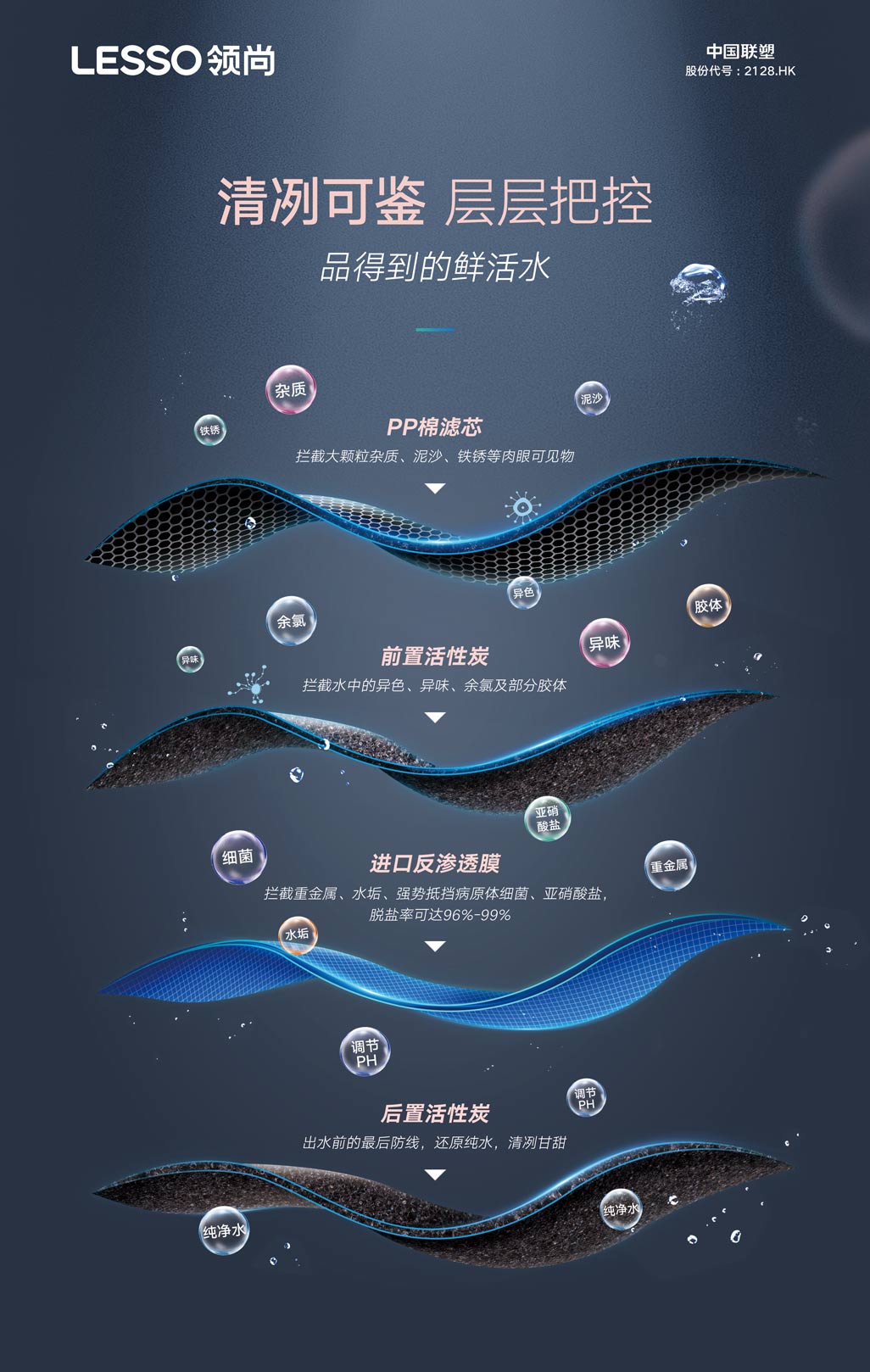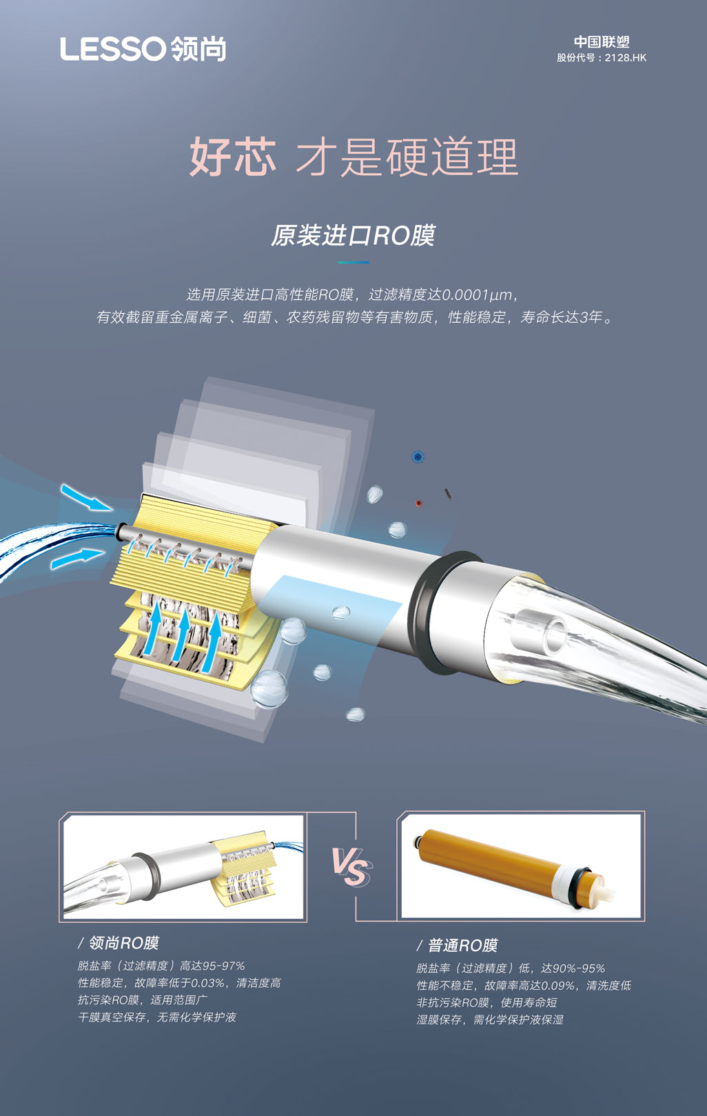 ⑤原裝進口RO膜,過濾精度達0.0001微米,有效攔截重金屬離子、細菌等有害物質
