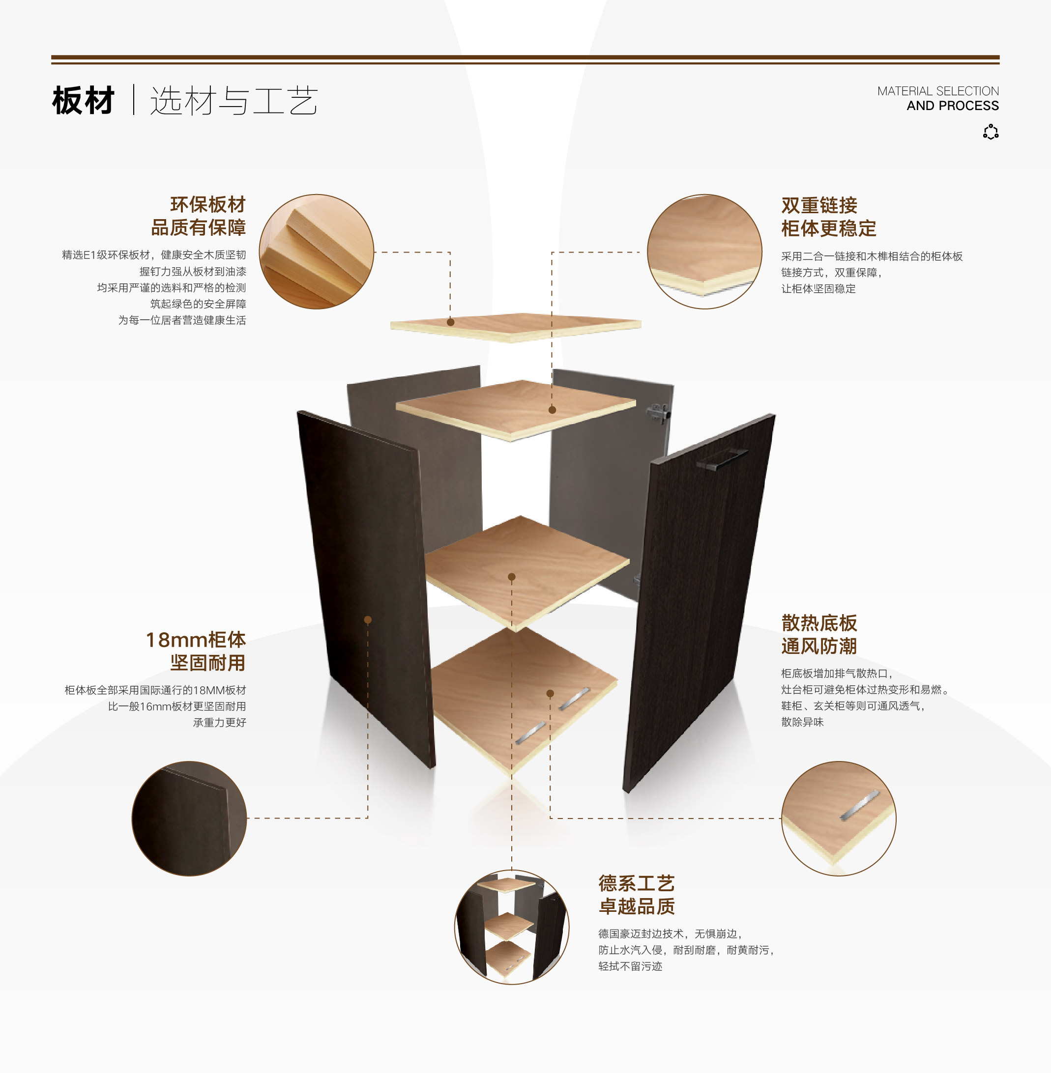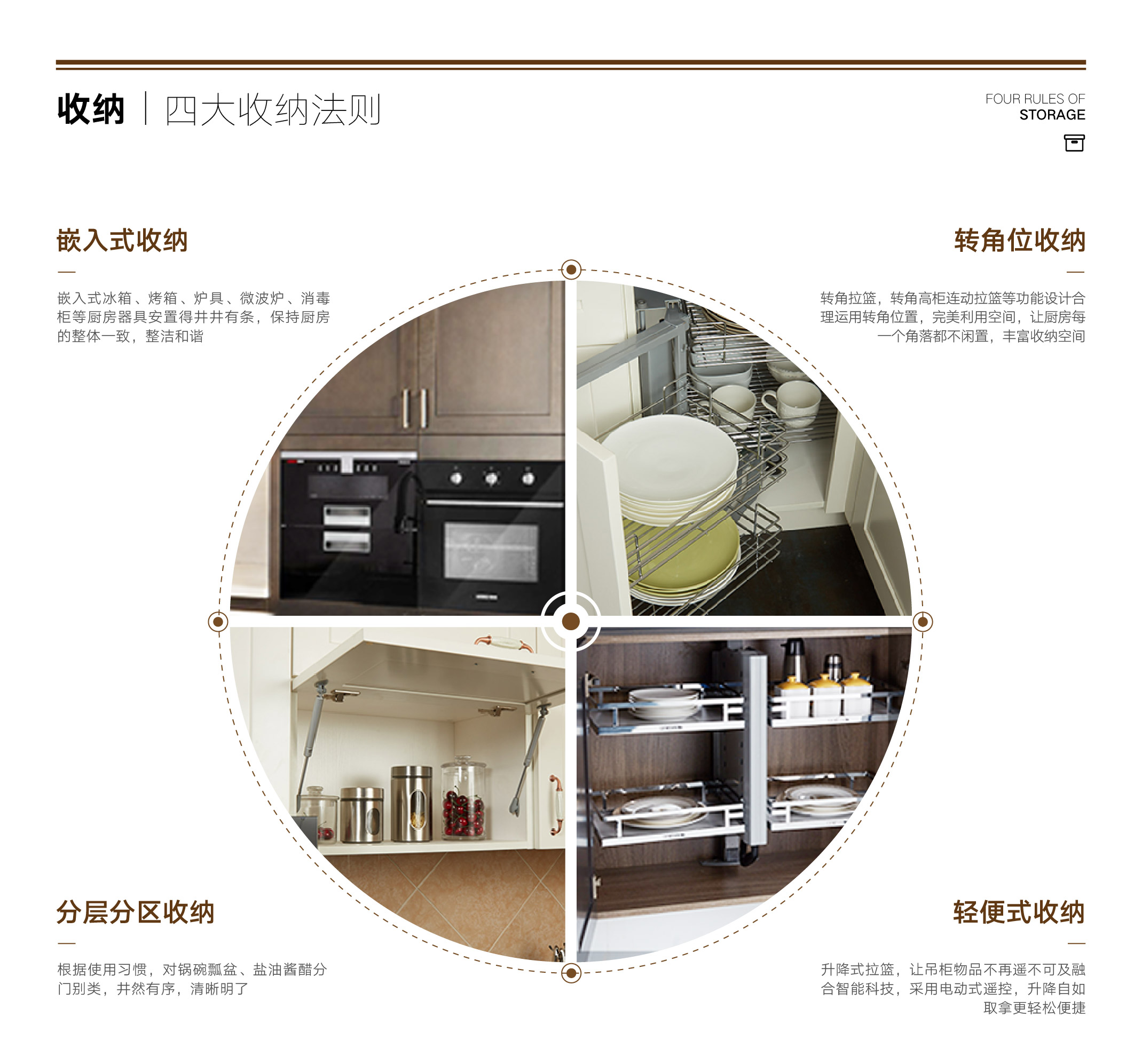 密封式收納柜:可存放鍋碗瓢盆以及不常用的調(diào)料、五谷雜糧。既能保證其密封性,不易粘塵和更適合保存,又能將雜亂藏于柜內(nèi)。