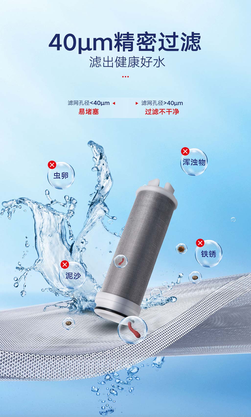 ②40微米高效精濾,食品級不銹鋼濾網(wǎng),有效阻擋紅蟲、泥沙等雜質(zhì)