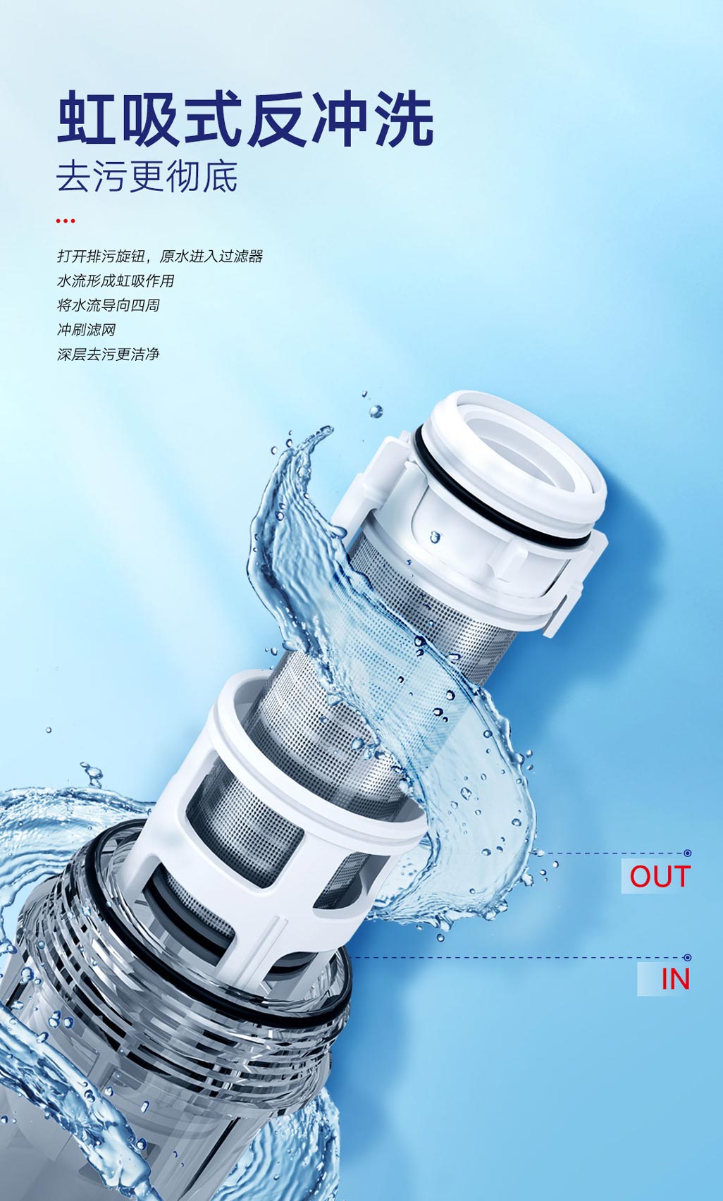③虹吸式反沖洗技術,雙面魔刮去除濾網(wǎng)表面及濾瓶內(nèi)壁污垢,深層有效清洗濾芯,讓濾芯壽命更長