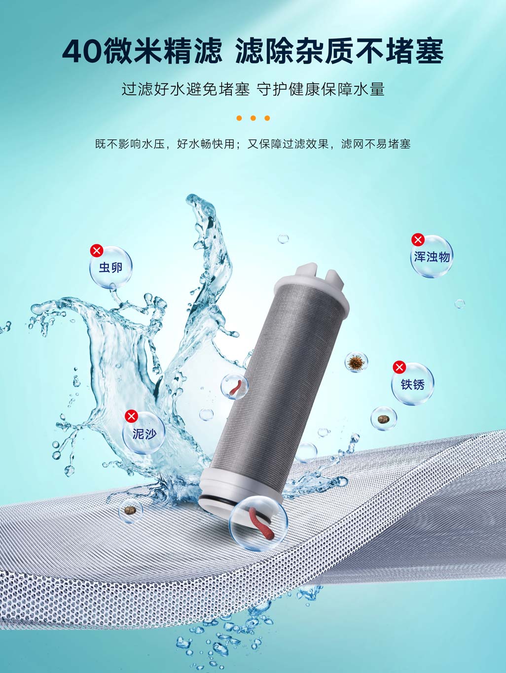 ②40微米高效精濾,食品級不銹鋼濾網,有效阻擋紅蟲、泥沙等雜質