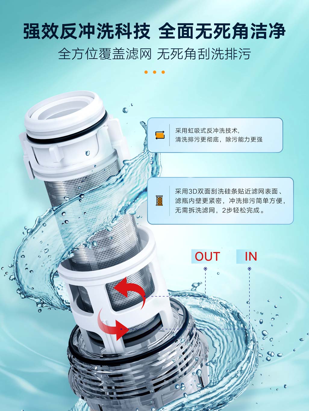 ③虹吸式反沖洗技術搭配3D雙面旋刮硅膠掛環,深層有效清洗濾芯,讓濾芯壽命更長