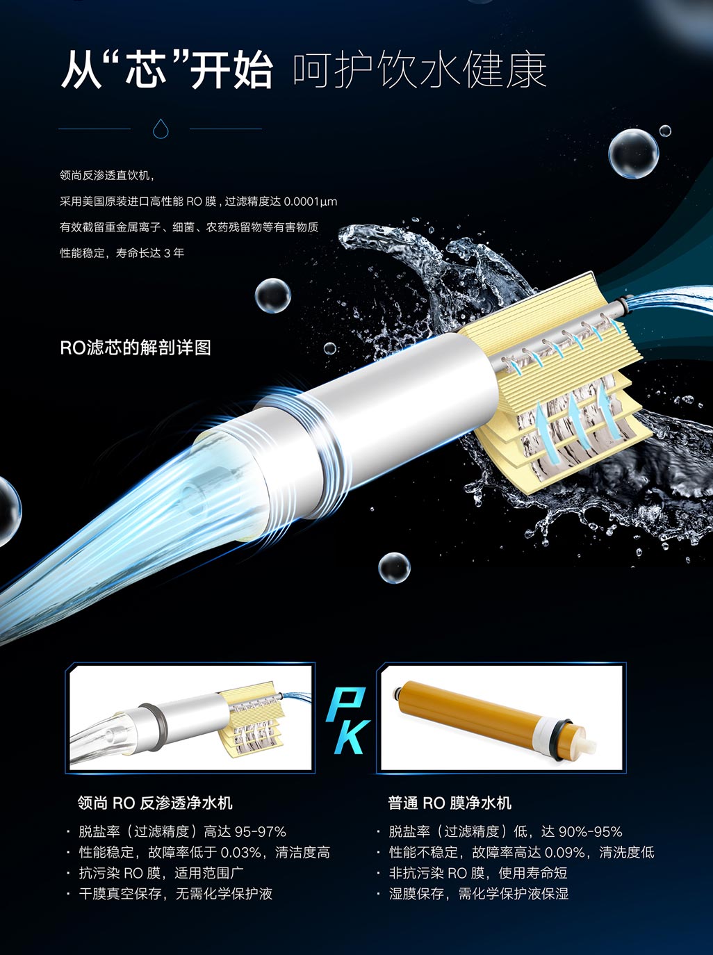 采用美國(guó)GE高性能RO膜,過(guò)濾精度達(dá)0.0001微米,有效截留